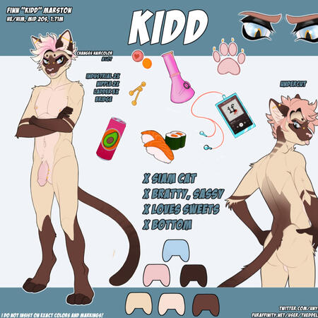 Base includes one front view, one back view, multiple items or headshot or genital shot, eyes, color palette, text, layout, nsfw/sfw version.